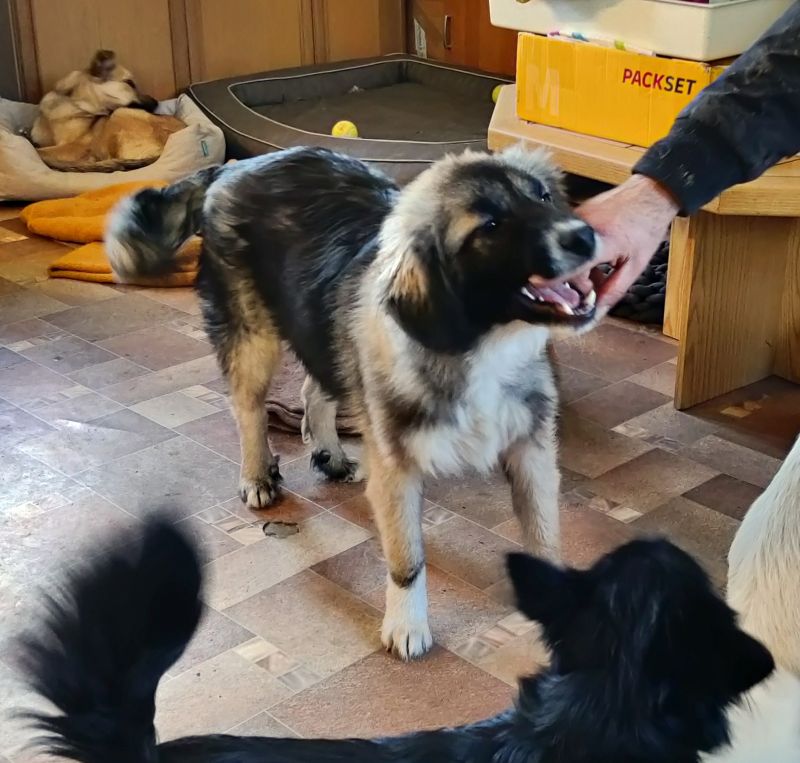 Mental scheint er keinen Schaden genommen zu haben. Er lebt hier im Haus mit vielen anderen Hunden zusammen und zeigt keine Ängste vor ihnen. Es hätte anders sein können. Er ist ein sehr freundlicher junger Mann, mag alle Menschen und auch Fremde sind ihm nicht unsympathisch. Er ist ein recht ruhiger Hund, der zwar gern spielt, dagegen aber auch seine Pausen genießt. Sein Lieblingsspiel ist, an den Fingern seiner Menschen zart herum zu knabbern.